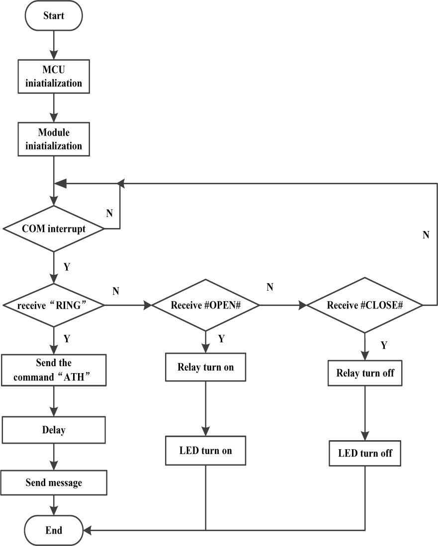 The program began, GSM module initialization, serial port to determine whether to interrupt if the serial interrupt, and then determine whether to receive the “RING” command, if the received command is sent on command, if not to receive orders and then to determine whether the received switch command, if the #OPEN# is received, the control relay is closed, LED lights, if received the #CLOSE# command, control relay off, LED lamp.