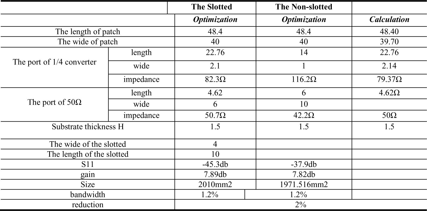 After hfss15.0 simulation, the results are obtained in Table I. The simulation results obtained by the two feeding methods are basically the same. The theoretical sizes of the slotted feed is closer to the simulated ones, even almost identical, and its electrical size is smaller. When optimizing in the way of the slotted feed, the workloads can be greatly reduced and the efficiency can be improved.