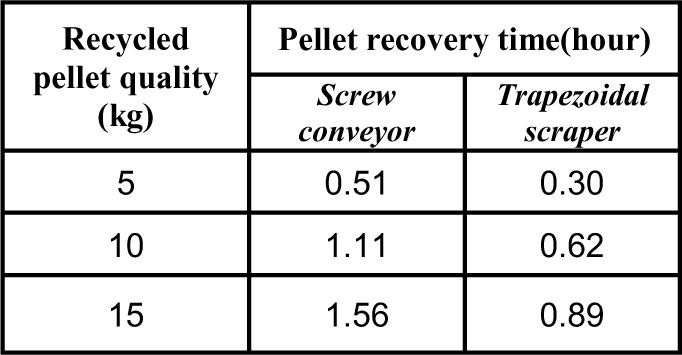 Data show that under the same condition, the time required to complete the 5 kg, 10 kg, 15 kg recycle by trapezoidal scraper is significantly less than that of the mechanical screw conveyor thus prove that the trapezoidal scraper pellet recycle system efficiency is much higher.