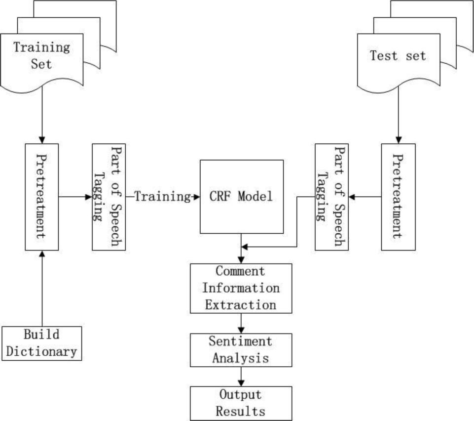 Based on the statistical method, this paper uses the CRF model as the main model and combines the constructed emotional dictionary to extract the comment information, as shown in Figure 1, it mainly includes building emotional lexicon, data preprocessing, part of speech tagging, training CRF model, using CRF model to extract theme words and sentiment words, judging the sentiment inclination of the extracted sentiment words and exporting final results.