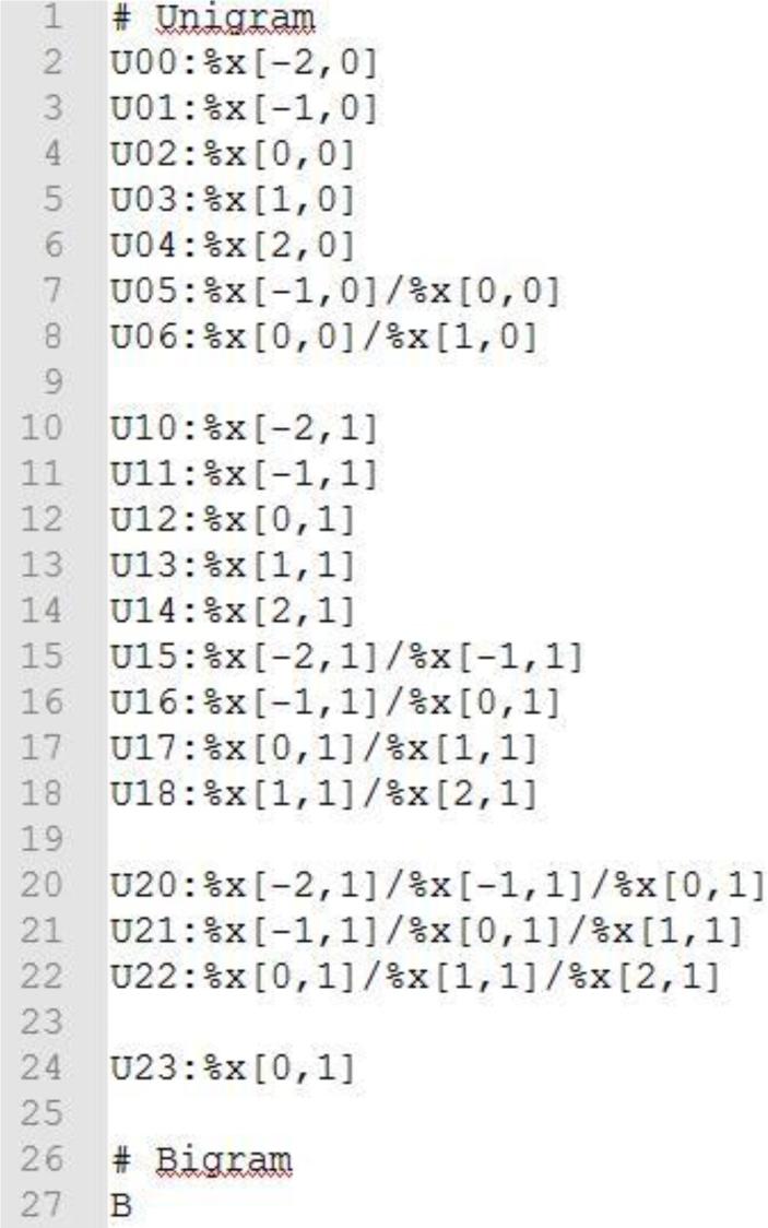 The CRF model is trained after the data set is preprocessed by word segmentation, annotation and so on. This paper uses the open source tool CRF++ to train the training model, the feature template needs to be prepared before the training model, and the feature template file of this article is shown in Figure 3.