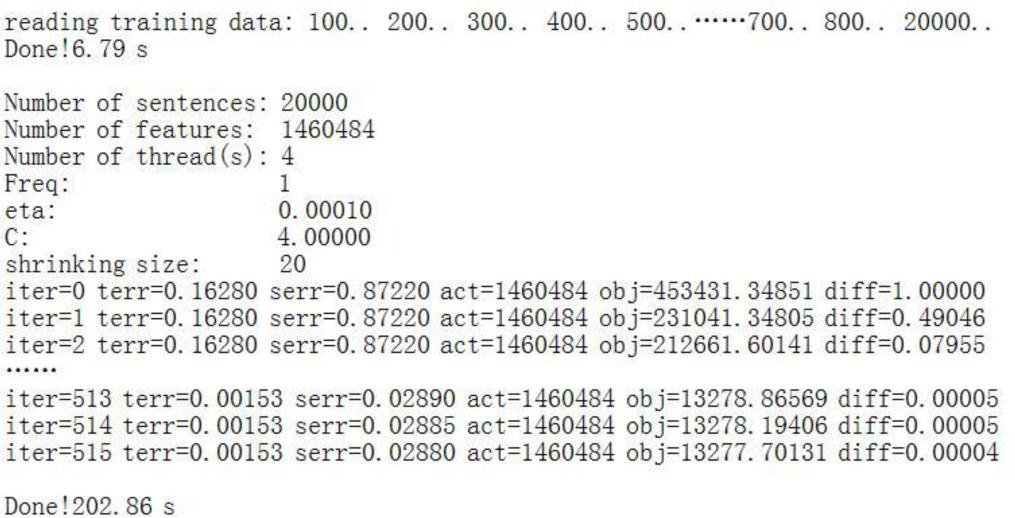 The T in “T**:%x[#,#]” represents the template type, where there are two templates altogether. The first is Unigram template, the first character is U, which is a template for describing unigram feature; The second is Bigram template, the first character is B. Two “#” respectively represent relative row offsets and column offsets, each line of “%x[#, #]” generates a CRF point (state) function: f(s,o), where “s” is the t time label (output), “o” is t times the context. The trained CRF model contains feature template and feature dimension, data set number, characteristic function and the weight of information, a series of information is output in the training process, and some of the information is shown in Figure 4. The meaning of the parameter information is as follows: