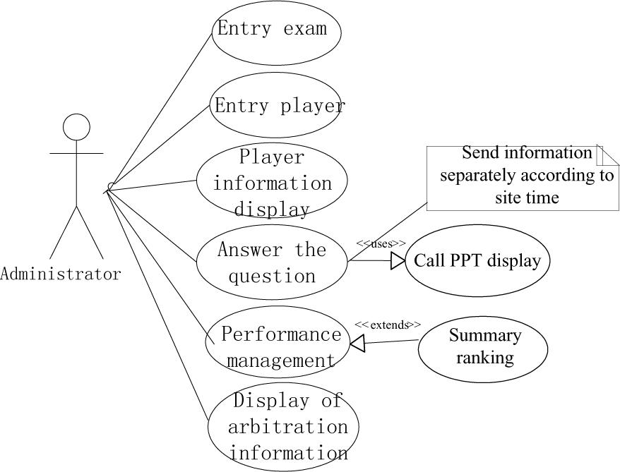 Record the team and team members information, access client input Chinese characters and display on the big screen, server controls the time of competition, show the correct answer after the client completed the submission. The judges give the points and calculate the result of the competition. The structure is shown in Figure 3.