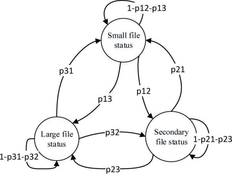 Moreover, according to the probability rule, the more detailed the storage state of the cloud storage system is, the more explicit the guidance of the data storage solution prediction will be. However, the greater the burden of computing resources needed for partitioning the state of the cloud system storage scheme. As we can see, in implementing the choice of cloud storage solutions, the degree of partitioning the storage state in cloud system storage scheme is a compromise decision problem. The more detailed the storage state is the more simplification is needed to reduce the computational burden. And the more storage states are, the greater the redundancy of the storage scheme. Therefore, the approach of partitioning the storage state not only complicates the analysis, but also reduces storage speed. In fact, storage status can't be considered completely, and it is difficult for the SReCSM to achieve multiple storage state ultimately. Therefore, in the study of the SReCSM, the partitioning of the storage state is appropriate. Obviously, the storage state defined in this paper can be divided into three state, those are large file status, middle file status and small file status. Whether for the actual data of the project or the simulation analysis, these three states are relatively simple and can better satisfy the requirement of data storage in cloud system.