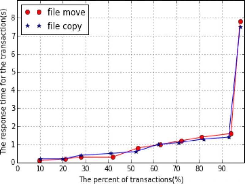 The data response tests are performed on file upload, file copy and file movement, for large files and small files respectively. Experimental results demonstrate that the page is properly displayed, and the response time of the login page is basically completed within two seconds. The percentage of the response time for the transaction is shown in figure 5.