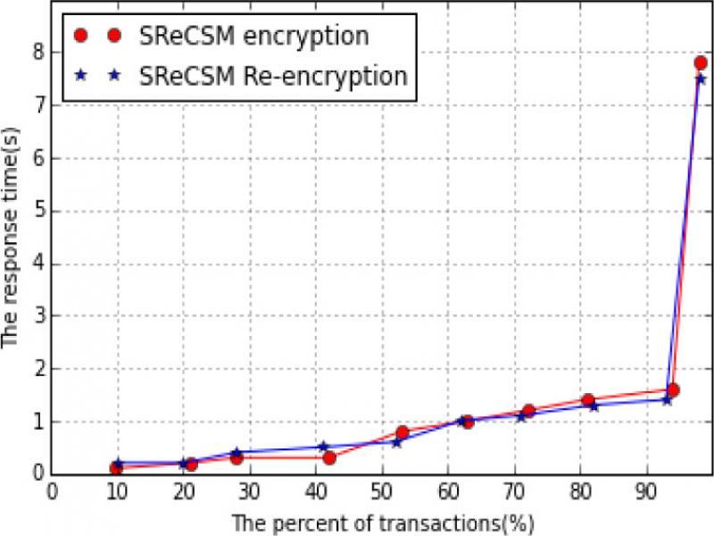The time comparison on SReCSM encryption and re-encryption is shown in figure 6. We can see from figure 6 that there is little difference between encryption time and re-encryption time.