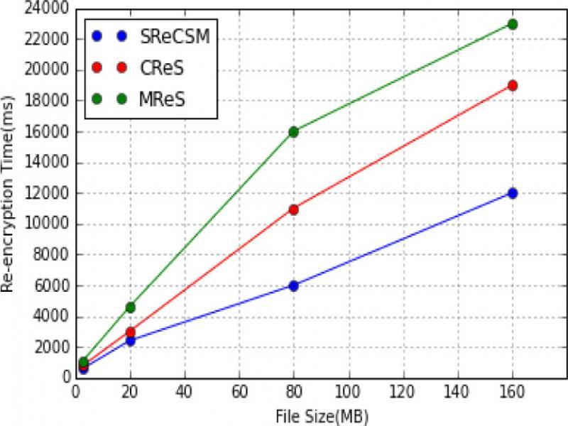 File size(M) MReS Re-encrypt(ms) CReSRe-encrypt(ms) SReCSMRe-encrypt(ms) 3.04 1048 770 720 23.15 3230 2901 2600 80.35 12010 10230 8560 167.58 23820 23612 23598