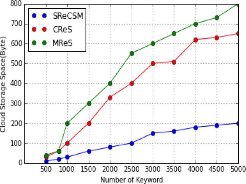 Figure 8 shows that the comparison graph of storage space in different algorithms. When there is increasing of the number of keywords, it requires more storage space. The existing algorithms CReS, MReS have require more storage space. But the proposed Searchable Re-encryption Cloud Storage Method (SReCSM) reduce the storage space requirement and utilize the data transfer effectively.