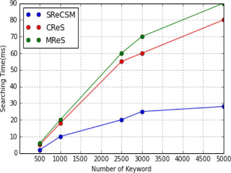 Figure 9 shows that the comparison graph of the searching time and number of keywords. The number of keyword vary from 500 to 5000. When the number of keyword increases, searching time also increase. In previous techniques, CReS and MReS use the more searching time. However, SReCSM uses lesser time to search the data. If searching word is not matched, immediately the proposed SReCSM uses the editing values. Based on this different cases, the proposed SReCSM decreases the searching time.