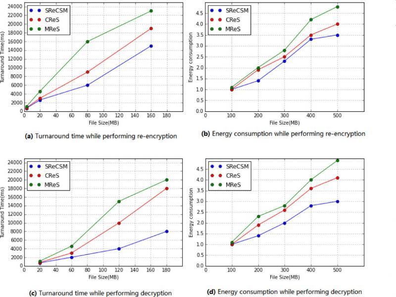 MReS, CReS, and SReCSM offload the re-encryption operations on cloud. Therefore, in this experiment we examined the turnaround time and energy consumption on cloud while performing the re-encryption operations. The experimental results are shown in Fig. 10.