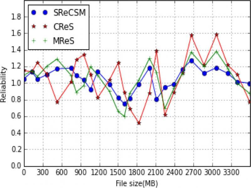 Using the reliability model formula (13) of the cloud storage system proposed in 4.4, combine the time required for processing the same size of file in table IV, when a different algorithm CReS, MReS and SReCSM is used, the encryption time required for encrypting file, after that the encryption time is reversed, Aj then be got after the encryption time is normalized. In the same way, after normalizing, storage cost Ak is got. If both Aj and Ak are closer to 1, and the number of storage state in the cloud storage system is larger, then the reliability of the system is higher. According to the above analysis, the data in one hour is sampled continuously, combined with the data in table IV and table V, the reliability contrast diagram for SReCSM is shown in figure 11.