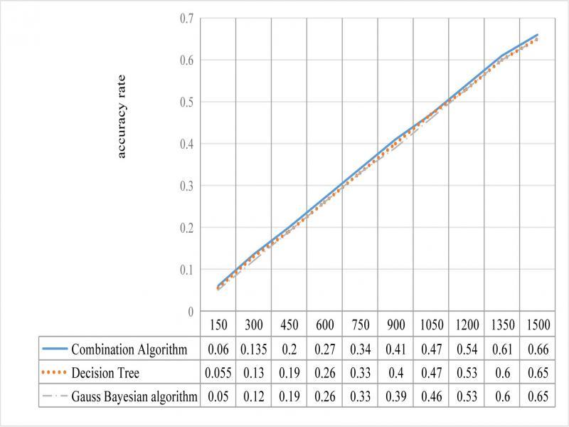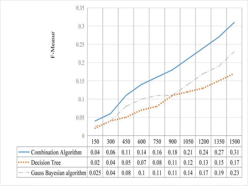 Experiment in figure 6, the X-axis represents the amount of data in the experiment, and the Y-axis represents accuracy, which shows that comparing with the three algorithms of decision tree, Bagging and Gauss Bayes, the combination algorithm has a slightly better accuracy. in figure 7, the X-axis represents the amount of data, and the Y-axis represents the F-Measure. The F-Measure of the combined algorithm is obviously superior to other three separate algorithms.