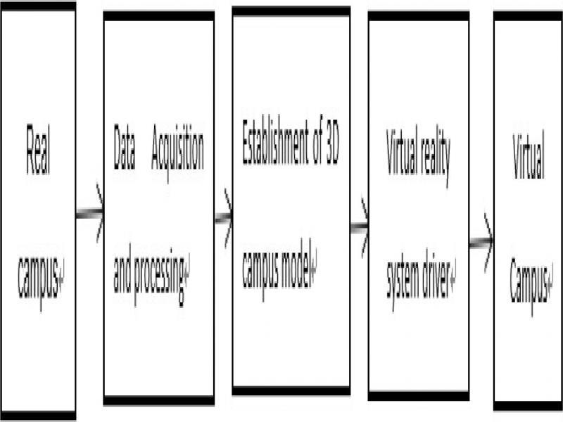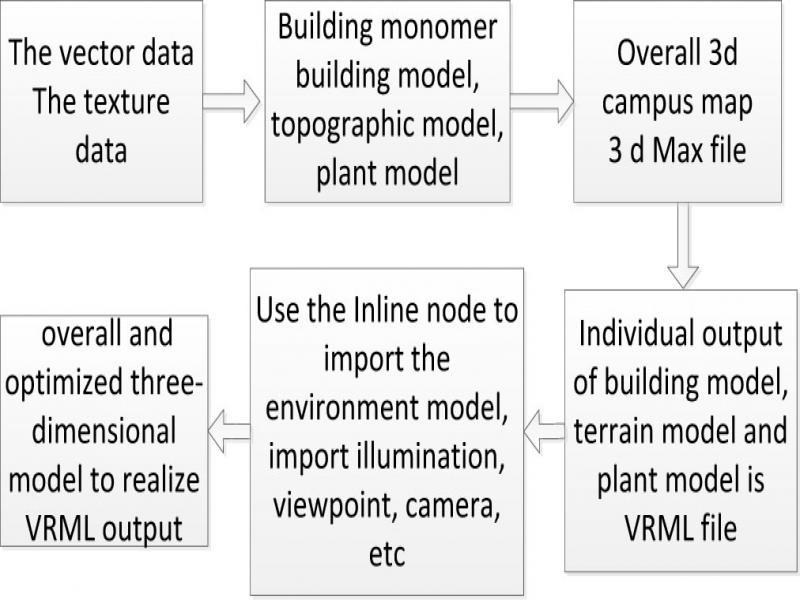 In the process of realizing the virtual campus, the complete 3d spatial data and image data are indispensable data for constructing the virtual campus.In the process of building topographic model, digital photogrammetry is usually adopted. Based on the basic principle of photogrammetry, the simulation model and digital model are generated by image processing and image matching using photos as original data, then convert into DEM format to input the formed DEM and digital map to the corresponding database. The data processing process is shown in figure 3.