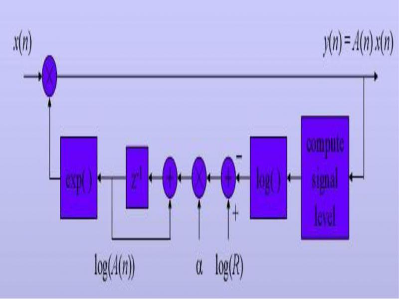 In order to make the response time faster, Before comparing with the comparative value R, The output value of the amplifier y(n) = A(n)x(n) is logarithmic before comparison. When the magnitude is less than R, log{|A(n)x(n)|} is less than log{R}. Therefore, log{R} − log{|A(n)x(n)|} is positive. The magnification becomes larger, Thus, the small signal is enlarged. When the magnitude is greater than R, log{|A(n)x(n)|} is larger than log{R}, therefore log{R} − log{|A(n)x(n)|} is negative, The amplification factor A(n) decreases, thus the attenuation of large signal is realized. Through the above algorithm, the small signal is enlarged, Large signal attenuation. Suppose the input signal is x(n) = cu(n), have
