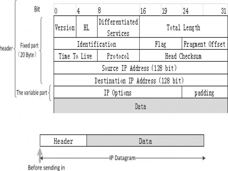 Figure 1 shows. The first line of the above section indicates the bits occupied by each field in the header format. The whole header format is divided into fixed part (20 bytes in total) and variable part. The variable part is to increase the function of IP datagram, but the variable header length of IP datagram also increases the overhead of each router to process datagram.