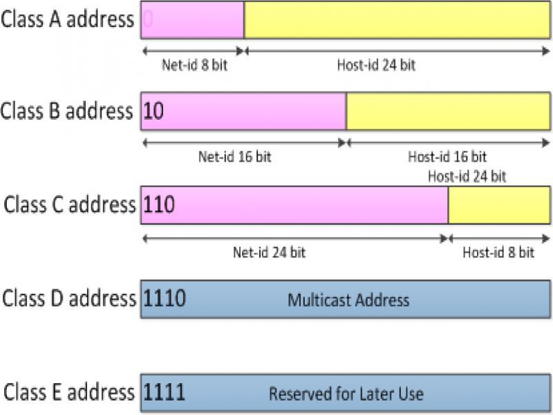 The network number field of address of class A, B and C (the field is pink in the figure) is 1, 2 and 3 word length respectively, while the category bit of 1-3 bits in the front of the network number field is specified as 0, 10 and 110 respectively.