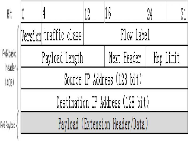 As shown in figure 6, the first line of the figure indicates the bit occupied by each field in the header format. Compared to IPv4, IPv6 fixed the base header with 40 bytes, eliminated many unnecessary fields, and reduced the number of private segments in the header to 8 (although the header length was doubled).