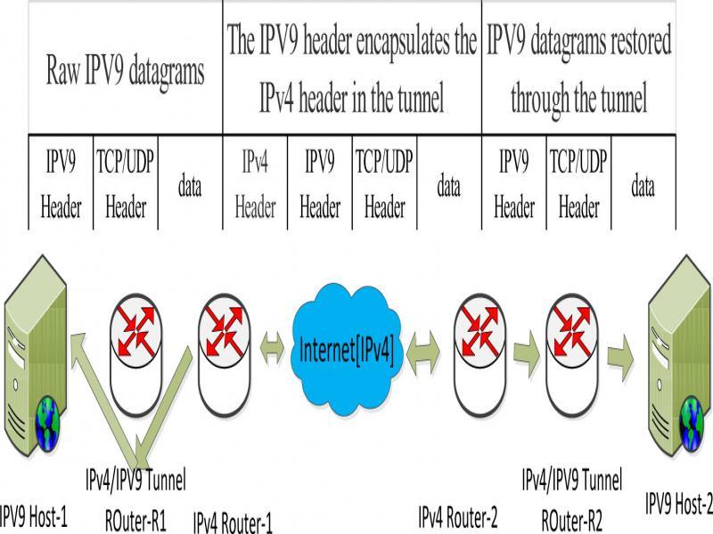 In order to solve the IPv4 flat to IPV9 transition, special design IPV9 transition address. Transitioning IPv4 to a 232 address in the IPV9 address allows a small change to the current system to complete the transition. In IPV9, there is a section of J.J.J.J address, where each “J” represents a decimal number from 0 to 28 (0~255), where the preceding [7] can be omitted in the middle of the local address, that is, local users (or designated users) can use J.J.J.J directly, which is different from the original IPv4 D.D.D.D. At the same time, this part of the user in order to smooth the transition to full decimal can be allocated at the same time decimal. In order to improve the software and hardware in the future, there is no need to re-address, such as [7]741852963 can be written into [7]44.55.199.35 can be directly used in a local IP network to write 44.55.199.35, so that the original terminal can be used. Interim IPV9 address system can be modified to the original IPv4 system. The IPv4 header is also used, but the version number is 9 to distinguish the original IPv4. However, users may use the original terminal equipment within the territory.