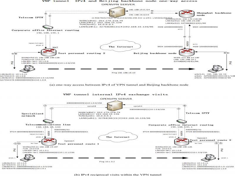 (a) one-way access between IPv4 of VPN tunnel and Beijing backbone node; (b) IPv4 reciprocal visits within the VPN tunnel