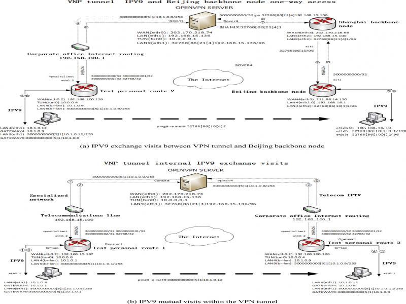 (a) IPV9 exchange visits between VPN tunnel and Beijing backbone node; (b) IPV9 mutual visits within the VPN tunnel