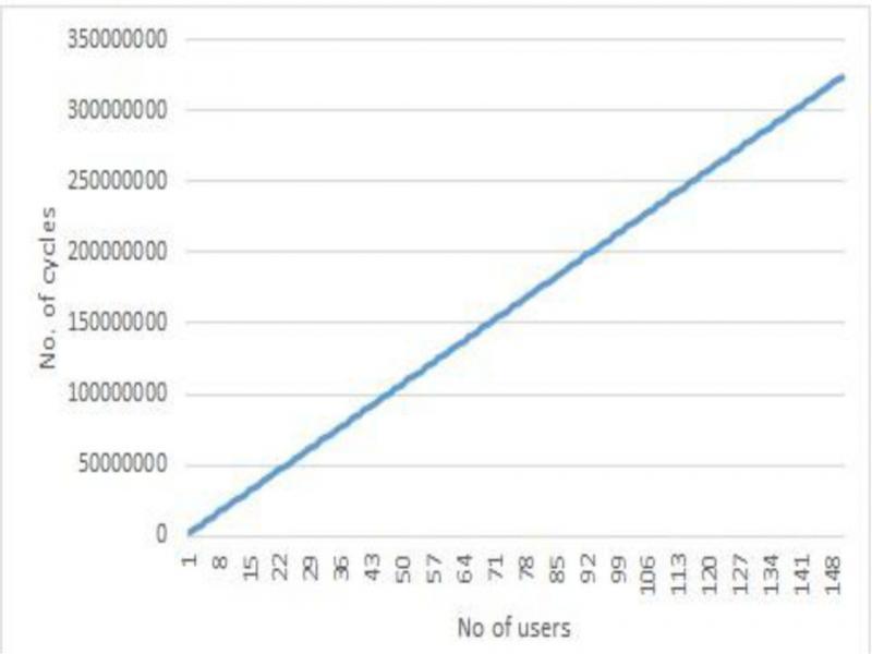 Also, computation cost, in terms of the execution time by the scheme for N = 200 points FFT, is obtained as shown in Figure 8. This shows that the computation cost increases as the number of users increases, and indicates that the scheme has low computation cost and can be easily adopted by any system that is characterised as computation and energy constraint system. Also, Figure 9 shows the energy consumption of the scheme in terms of number of cycles required. This also indicates that the proposed scheme is energy-aware since energy consumed by a processor is approximately proportional to number of cycles or frequency f, and to the square of the processor voltage V [14].