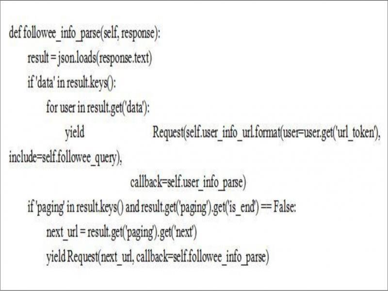 Follower_info_parse has two functions: first, it can initiate requests for user information through the attention list; second, it has the function of turning over pages. By parsing the response, it can obtain all users of the current target attention list and obtain detailed information of users. There is also the function of page scheduling to get the list of concerns on the next page. Further requests are then retrieved recursively for circular crawling. Followee_info_parse, which can request user’s detailed information through fan list, also has the function of turning pages. Its implementation logic is exactly the same as follower_info_parse, except that the object of the request is different. One is to request detailed information from the person concerned, the other is to request detailed information from the person concerned with the current user.