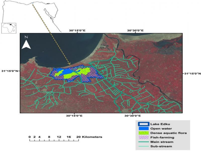 With growing population and development activities, the Nile Delta of Egypt experience challenging conditions. Lake Edku is located within the active Northwestern coastal zone of the Delta, between longitudes 30°8’ & 30°23’E and latitudes 31°10’ & 31°18’N (Fig. 1). The lake is characterized of having systematically shrinking free open water, altered ecosystem and deteriorating water quality state (Abayazid, 2015). Edku lake serves an active agriurban basin, and bordered by dense aquaculture practices. Accordingly, the lake receives wastewaters with different pollution degree from fish farming therapeutic drugs, nutrient flux from agricultural drainage network (e.g. Edku, El-Boussili, Khairy and Bearsik drains), in addition to effluents from municipal WasteWater Treatment Plants (WWTPs) and industrial facilities (Siam and Ghobrial, 2000). The lake is connected to the Mediterranean Sea with single opening “Boghaz Al-Maadia”, which allows temporal tidal inflows and localized saline water interaction. Discharges with heavy nutrient levels, as well as the deceased salinity inputs, have encouraged excessive unwanted aquatic vegetation. That, in turn, disturbed natural circulation; flow dynamic and sediment transport, and hence self –purification within the lake (Hossen and Negm, 2017).