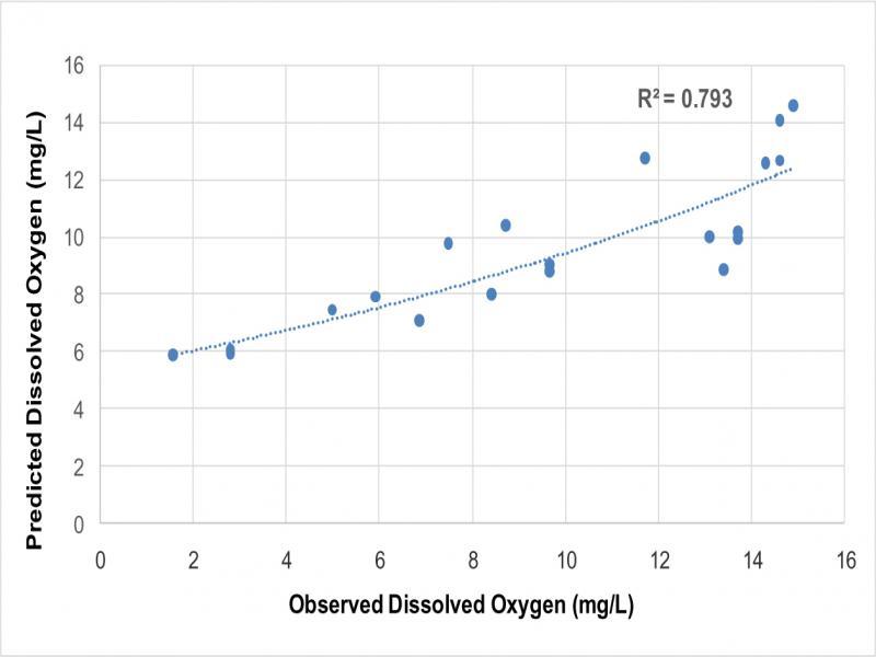 Optimal derivative capacity for DO levels in Lake Edku, with least input parameter requirements, hence less processing works and costs, was found by using only Turbidity and natural logarithm of Temperature. The developed algorithm model, stated in Equation 7, proved reasonable fitness with regression coefficient of 0.79 (Fig. 8).