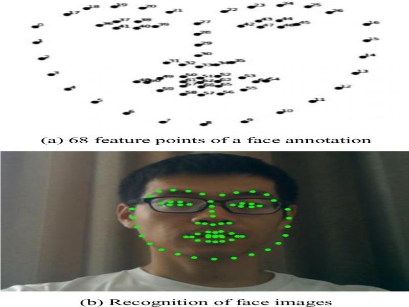 The method proposed in this paper is to judge the driver’s fatigue driving according to the characteristics of the human eye. Because the digital image processing open source visual library OpenCV comes with a human face detection library, but the disadvantage is that the lighting requirements are very high, the lighting slightly changed, it will be difficult to locate or inaccurate positioning[7]. Therefore, this paper chooses Dlib open source library to detect human eye features. Firstly, the 68 face feature points provided by the Dlib open source library are used to accurately calibrate the position of the face and the human eye, and then the aspect ratio between the length and the width of the human eye is measured. Finally, the Kmeans clustering algorithm is used to analyze the collected ratio. The threshold of blinking. Figure 1 below, a is the 68 face feature points marked by Dlib, and b is the feature point on the face of the paper.