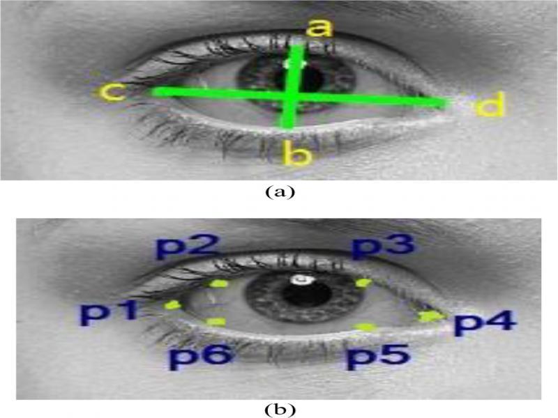 There are currently many methods in the field of blink detection. Andrej Fogelto et al[8] analyzed the relationship between the speed of blinking and the duration of time through the cyclic neural network (RNN), so as to better distinguish the state of blink and blink, through the comparison of one-way and two-way circulating neural networks. One-way neural networks work better in blink detection. However, neural networks have their own limitations. For example, network merging will lose a lot of information. In the field of face recognition, the relationship between part and whole is neglected, and each person’s face features are different, so it takes a lot of time to train. parameter. RenAnhu et al[9] trained the blink classifier through the AdaBoost algorithm, but the AdaBoost algorithm is very sensitive to the discrete data of the blink. The detection of the eye part during image processing is easily affected by the speed of light and object movement, just as the blinking behavior is fast. the process of. ZengYouwen et al[10] used the correlation between computer signals and the number of blinks to determine the fatigue state, but the experiment required special equipment and equipment, and the operation was difficult and difficult to implement. Since the blinking algorithm proposed by Soukupová[11] has measured the blink threshold of the aspect ratio of the eye, using the support vector machine[12] method to analyze the collected threshold of the blink to finally obtain an EAR of 0.2, the algorithm of this paper is the In addition, by measuring the aspect ratio of the eye, the Key clustering algorithm in machine learning is used to obtain the blink threshold. As shown in Figure 2.1a, the absolute value of the longitudinal distance ab of the eye will become smaller when the eye is blinking. At this time, the ratio of cd to ab will suddenly become larger, so we analyze the threshold when the ratio becomes larger when blinking. Figure 2a shows the distance between ab and cd, and b is the position of the human eye feature point marked by Dlib. This paper proposes the blink threshold formula as follows: