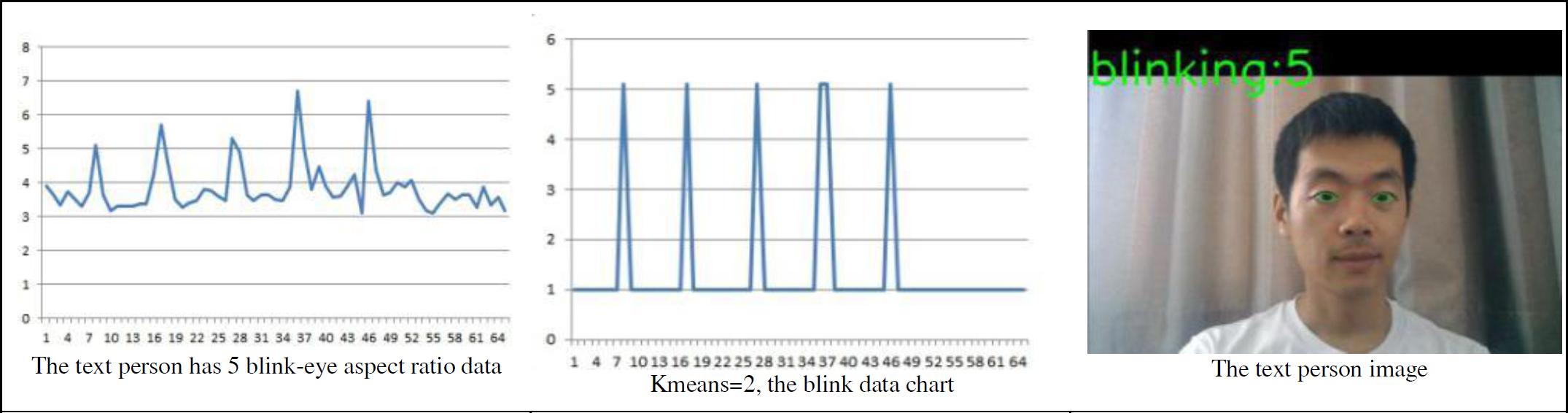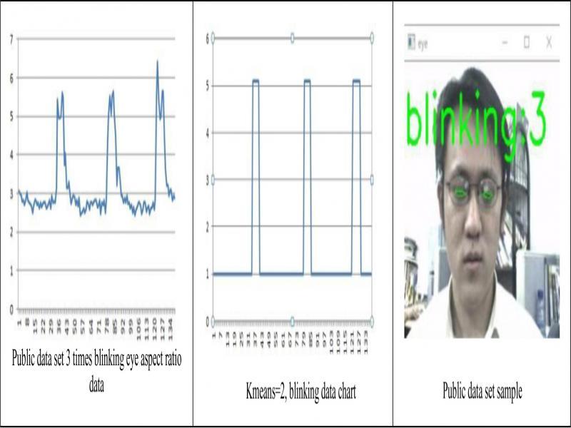 This article mainly introduces two aspects, one is to introduce the source of the experimental data set, and the other is to analyze the experimental data. Figure 3 shows the author’s own data collection and analysis. From left to right, the first picture is the analysis of the blink value of the author’s 5 blinks, and the middle figure is when the blink threshold is 5.1 when Kmeans = 2 The blink data graph, the right graph is the actual record of the author’s experiment. Figure 4 shows the data of a random experimental sample in the public data set. From left to right, the first figure analyzes the blinking value of the aspect ratio of the 3 blinks in the experimental sample. The blink data graph at 5.1, the right graph is the actual record of the experimental sample.This article uses the blink data set provided by Zhejiang University[13]. All the data in the data set is collected under the natural light of the room. There is no special illumination. The collected equipment is a common camera that comes with the computer. There are 80 video clips and 20 people participate., four segments per person, these four segments represent a. front view without glasses; b. front view with thin edge glasses; c. front view with black frame glasses; d. View. Participants spontaneously blink at the front of the camera at normal speed. The size of each video is 320*240, the frame rate of the video is 30fps, and the duration of recording is generally about 5 seconds. The experimenter usually blinks about 1 to 6 Times, a total of 255 blinks. The following are the results of data collection and analysis.