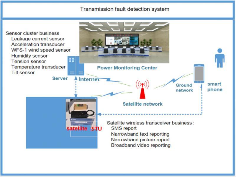 The transmission fault monitoring system, consisting of tower poles, sensor cluster, satellite wireless transceiver, power monitoring center, and mobile phone of the responsible person, to realize the status monitoring, information reporting, and fault early warning of the transmission line. The transmission fault monitoring system is a supplement to the online monitoring system of the entire smart grid transmission line. By using satellite technology, it provides strong support in areas that cannot be covered by existing monitoring systems.