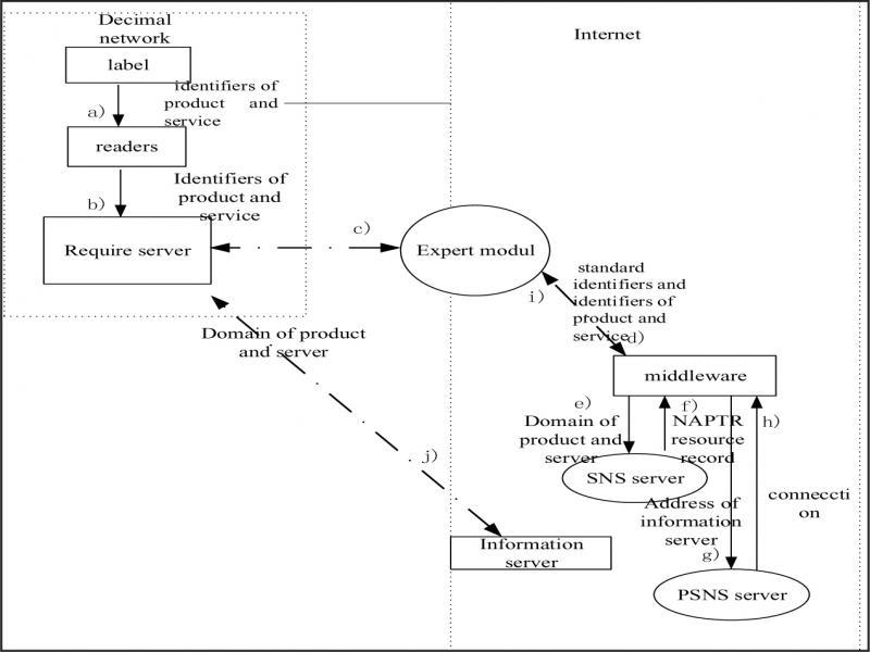 When the related product information is stored in the Internet information server and label coding format is using able format, the decimal network based on D-ONS accessing the information query process of Internet mainly involves the following several key modules: decimal network query server, decimal network, expert module, information server middleware, the SNS and PSNS server. The access relationship between these modules is shown in figure 3.