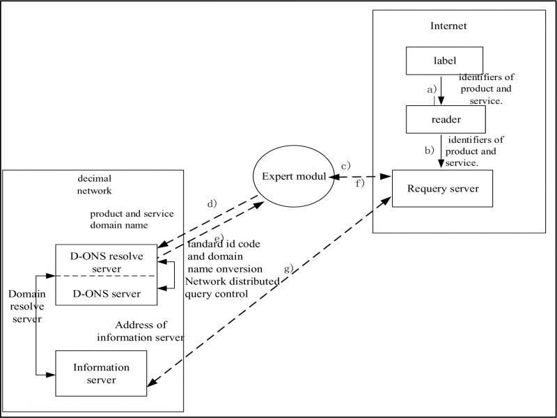 When product-related information is stored in the information server of the decimal network, and the label encoding format is IPV4 or IPV6 format, the D-ONS based decimal network needs to be accessed through the Internet network. The access process involves the key modules: Internet query server, expert module, D-ons server, information server. The access process is shown in figure 4.