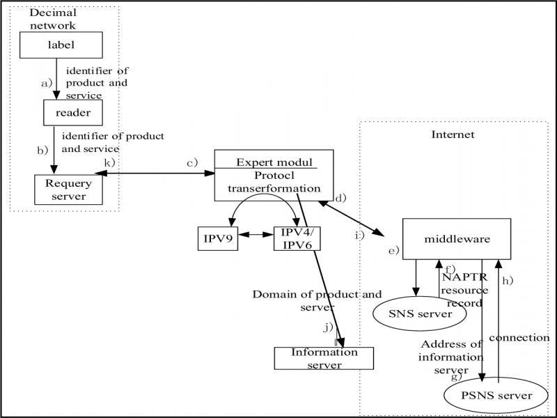 The architecture of RFID tag information query service on Internet is based on IPV4 and IPV6 protocols. Routing adopts IPV4 and IPV6 protocols, and resource positioning is completed by SNS and PSNS. The architecture of electronic tag information location query service based on decimal network is a network architecture based on IPV9 protocol, including the following two ways.