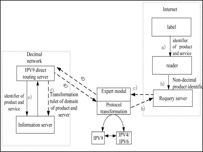 In the direct routing mode, if the product’s RF tags are encoded in IPV4 and IPV6 protocols, and the product-related information is stored in the server of the decimal network, the query process needs to involve IPV9 router, information server, expert module and query server.