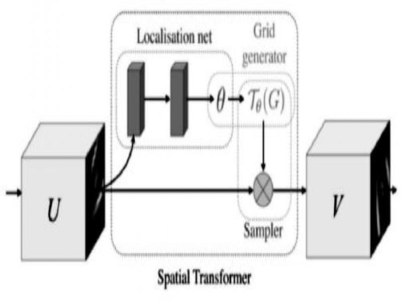 The Google DeepMind team proposed a self-contained transformation module to flexibly and efficiently extract image invariant features[15], the specific structure of the module is shown in Figure 3, the model named Spatial Transformer is mainly composed of three parts: Localization Network, Grid generator and Sam-pler. Localization Network uses input feature mapping and outputs spatial transformation parameters through multiple implicit layers; Grid generator uses predictive transformation parameters to create sampling grids; Sampler uses feature mapping and sampling grid as inputs to generate output mapping from grid points.