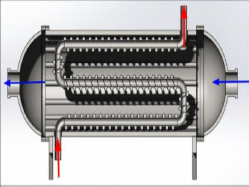 Sectioned SolidWorks model of shell and tube heat exchanger with copper coil and finned inner wall.