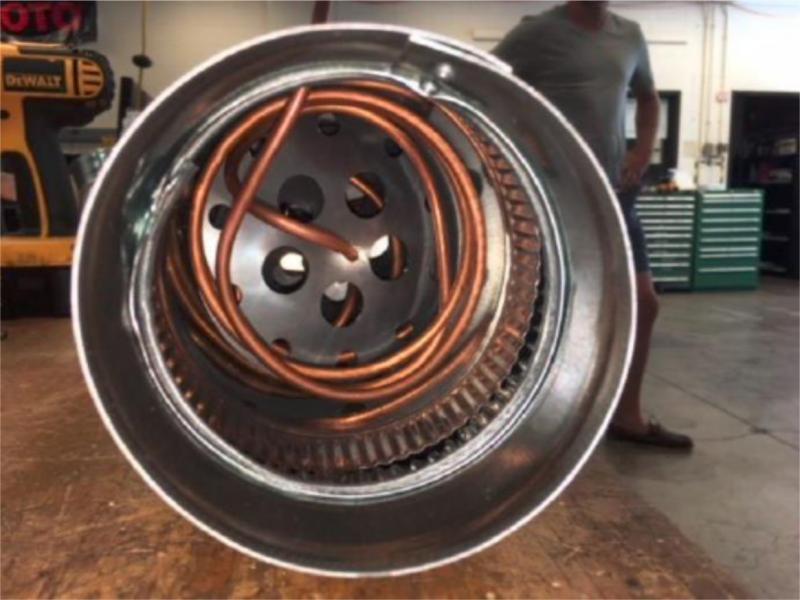 Initially the shell of the heat exchanger was going to be formed using sheet metal. With concerns of burn-through while welding the shell together it was determined that buying HVAC duct would reduce manufacturing time and eliminate concerns of sealing the shell together. The second difference between the prototype and the model is the use of fans to send air through the shell. Initially the plan was to incorporate fans within the shell that would send air through and out the other side. The main concern with this idea was if we were going to be able to vary the fan speed for calculation purposes. It was determined that a 4” flexible duct was attached from the heat exchanger to the wind turbine in Wentworth’s Fluid Dynamics Lab where we would be able to vary wind speed during testing. Not only did this decision save money it also eliminated doubt from our calculations. The third difference is the overall length of the prototype. This work initially planned to make the shell 18” long with 6” diameter. While we kept the diameter the same, the heat exchanger is now 24” long due to the need for an additional connection piece for the HVAC duct that was not initially incorporated into the SolidWorks model.
