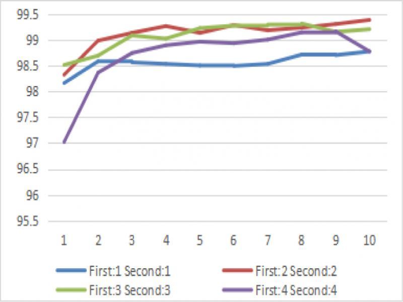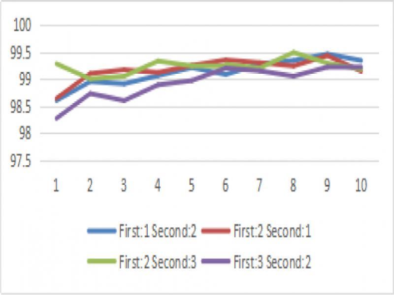 As shown in the Figure 11, the training time and classification accuracy of the network are compared under different collocation times of “primary route” and “secondary route”. From the analysis of the data in the table, if only from the classification accuracy, the combination of “main route” iteration twice and “secondary route” iteration three times is the best, but the training time is long. If the training time and classification accuracy are considered comprehensively, the primary route is best to be iterated once and the secondary route is iterated twice.