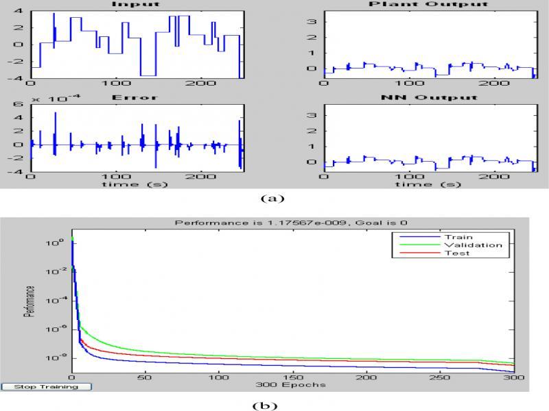 For a module description of the alleged object behavior in the predictive control based on neural network belong to forward model of system, there use the training methods as shown in Fig. 4, where dashed box picture shows the actual controlled object, here is the Simulink block diagram of the robotic arm, at random input signal u to produce output y. Selected BP neural network with one hidden layer as training model of a controlled object, set the number of hidden layer neurons is 10, using the Levenberg-Marquartdt learning rules, with the group [u, y] data training neural network model of the charged object, the results shown in Fig. 5, where Fig. 5 (a) is the data used for training, Fig. 5 (b) is convergence diagram for training.