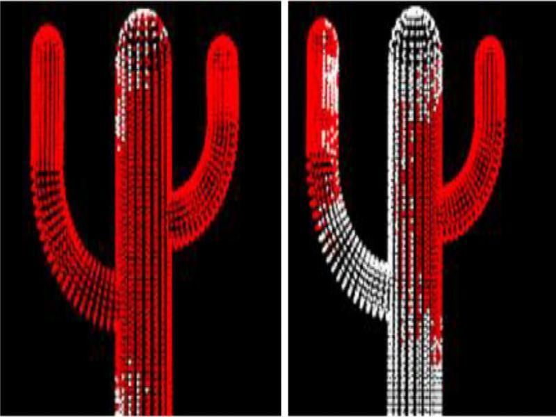 As shown in Figure 4, the initial point cloud of the cactus point cloud model is red, and with the progress of the region growth algorithm, the white point cloud gradually increases. If the segmentation threshold is not set, the white point cloud will eventually cover the whole model. However, in this process, we choose the appropriate boundary and curvature threshold value, then we can get a reasonable segmentation result.