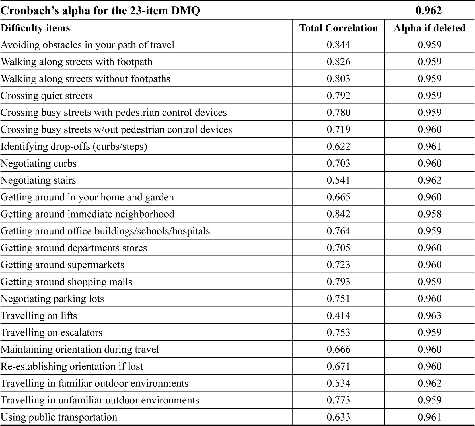Cronbach’s alpha for the DMQ as a whole and Cronbach’s alpha if each of the 23 DMQ items were deleted from the measure.
