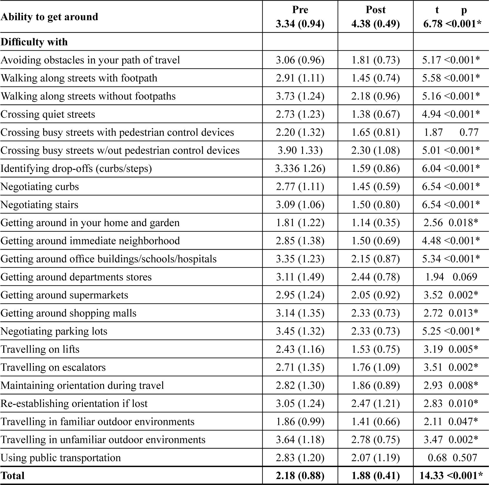 Pre and post test scores for ability to get around, total mean difficulty score and each of the 23 separate difficulty items.