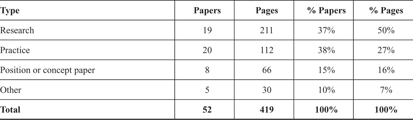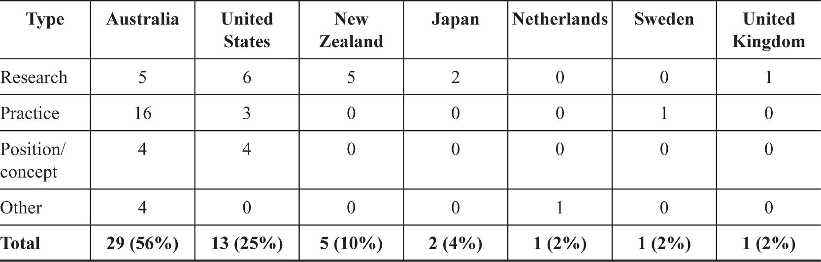 Although published in Australia, the name of the journal suggests that its intent was to be an international forum for literature in this profession. A review of the affiliation of the published authors suggest that this intention has, in fact, been realised with 44 % of all papers published in the first six volumes having first authors from outside of Australia, and more than a third (34%) from outside of Australasia. The majority of the research papers (74%) came from sources outside of Australia compared to 50% of the position/concept papers, 20% of practice papers and 25% of papers in the ‘other’ category (Table 3).