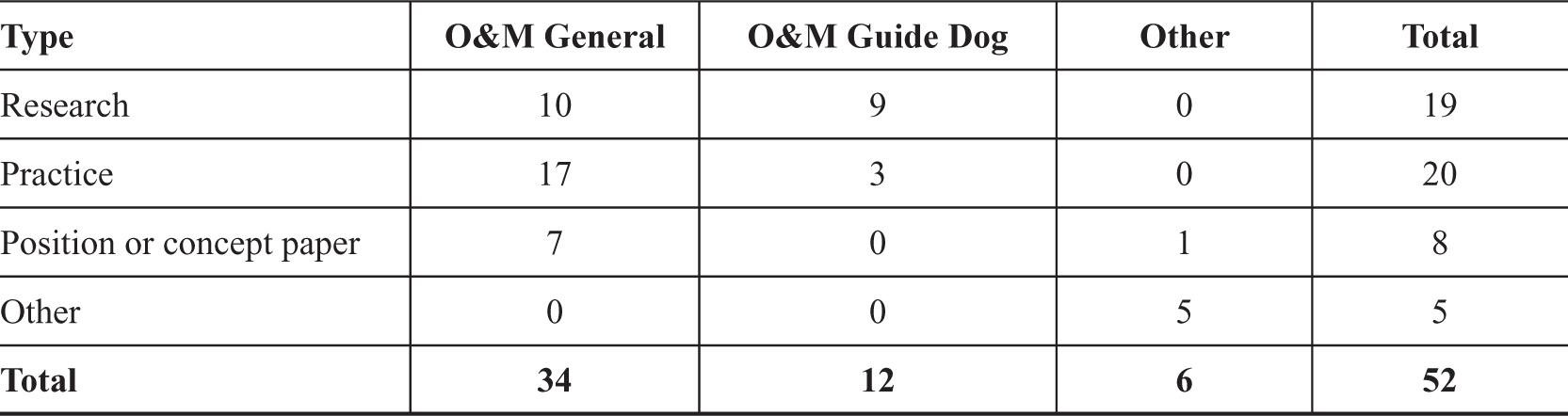 While topics varied, the majority (88%) did focus on topics directly related to O&M (O&M in general and O&M including guide dog mobility) as the name of the journal suggests. The surprising finding was the number of articles devoted to guide dog mobility (12). It is also interesting to note that the majority of the papers focusing on guide dog mobility (9) reported the findings from research studies. This, I believe would make IJOM the leading peer reviewed forum for reporting research related to dog guide mobility in the world (Table 2).
