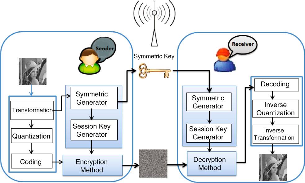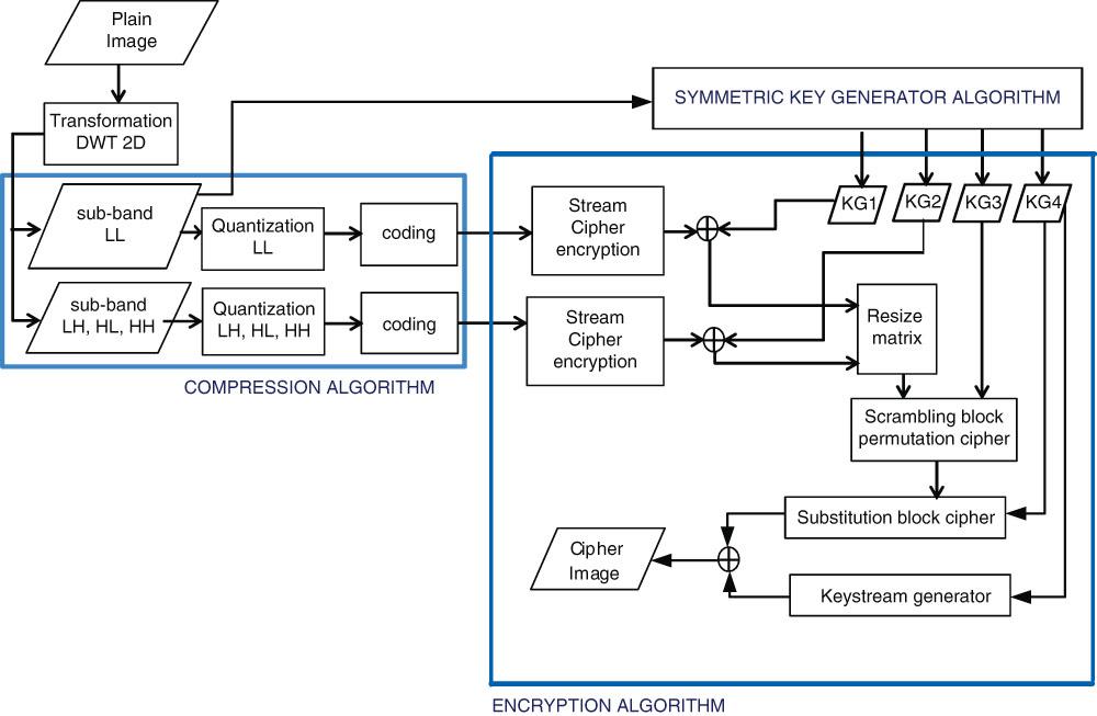Discrete Wavelet Transform (DWT) is one of the methods used in digital image processing. DWT divides the image into four sub-bands denoted LL, HL, LH, HH. The LL sub-band looks like the original image and smoother as it contains the lower frequency components of the original image. Sub-bands LH, HL, and HH will look like a rough version of the original image because they contain high-frequency components of the original image. Existing research develops a compression–encryption scheme using a selective concept of encryption of data on LL sub-band, while and LH, HL, and HH sub-bands are transformed using different algorithms (Al-Maadeed et al., 2012; Xiang et al., 2014; Wang et al., 2015; Hamdi et al., 2017; Kumar and Vaish, 2017; Vaish et al., 2017). Selective compression–encryption models are proposed in (Kumar and Vaish, 2017; Vaish et al., 2017; Wang et al., 2015) by encrypting each sub-image and then compressing each using a different algorithm. In Wang et al. (2015), before DWT transformation, Schema Lifting (LS) is performed, which is followed by the quantization method and arithmetic coding. On the other hand, in Kumar and Vaish (2017), LS is not used, and after the encryption process which uses permutation coefficients on LH, HL, and HH sub-bands, the compression process is performed using Singular Value Truncation and Huffman methods. Then, the encryption process is applied to LL sub-band using the pseudorandom method, which is followed by compression. Another selective method is performed by combining the LW sub-band of DWT results and the error measurements, while the LH, HL, and HH sub-bands are combined using the maximum method. The information of LL sub-band is compressed using error measurement, encrypted using a coefficient permutation, and finally encoded. The LH, HL, and HH sub-bands are compressed using quantization parameters, encrypted using permutation coefficients and encoded using the Huffman method (Vaish et al., 2017).