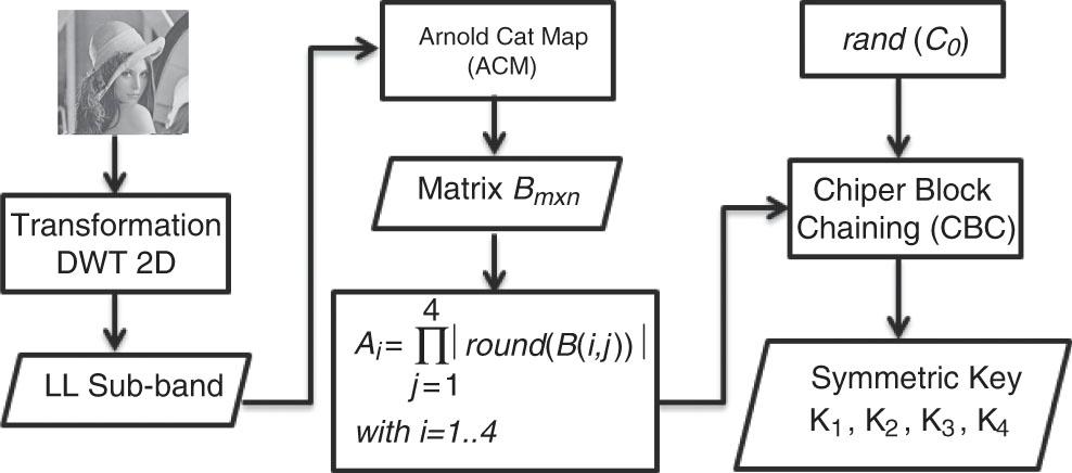 This step is performed to obtain KG1, KG2, KG3, and KG4 session keys used to encrypt each compressed sub-band and to randomize the pixel position.