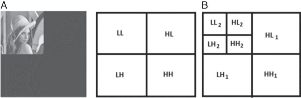 At this stage, if the plain image size is n × n pixels, the decomposition process is repeated until level L, that is, until the size of the produced LL sub-band is nLL × nLL, with 32<nLL≤64pixel. For example, if the plain image size is 256 × 256 pixels, the DWT 2D transformation will be performed until the 2nd level, because the LL sub-band size on the 2nd level has reached 64 × 64 pixels. If the plain image size is m × n pixels, the decomposition of DWT 2D transformation is performed until the sub-band LL size of
