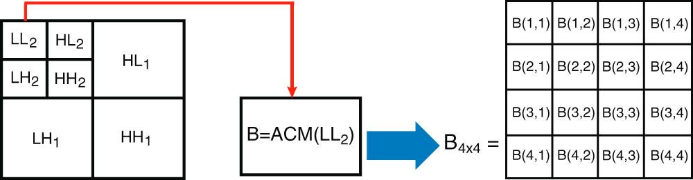 Step 2: Scramble the position of LL sub-band data element produced by the L-level decomposition. The positioning of mLL × nLL sized data is conducted using Arnold Cat Map (ACM). The goal is that the value of neighboring matrix elements is significantly different. The definition of Arnold’s Cat Map is presented by (Zhu et al., 2011; Wang et al., 2015);